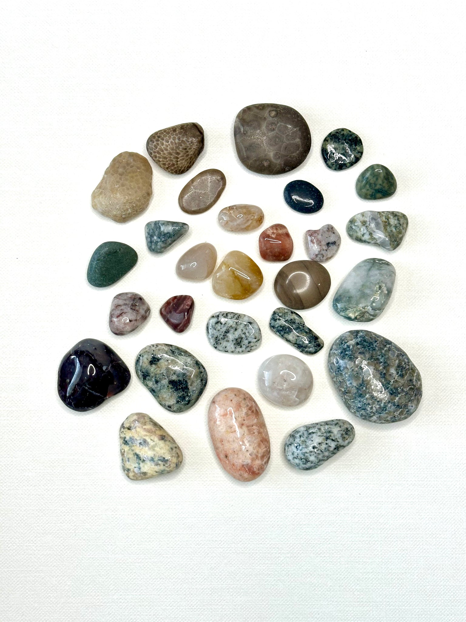 Assortment of polished Michigan rocks including 2 Petoskey stones, Charlevoix stone, and additional fossil. Rocks are loose and will come in a velvet drawstring bag to avoid damage to the frame and print.
