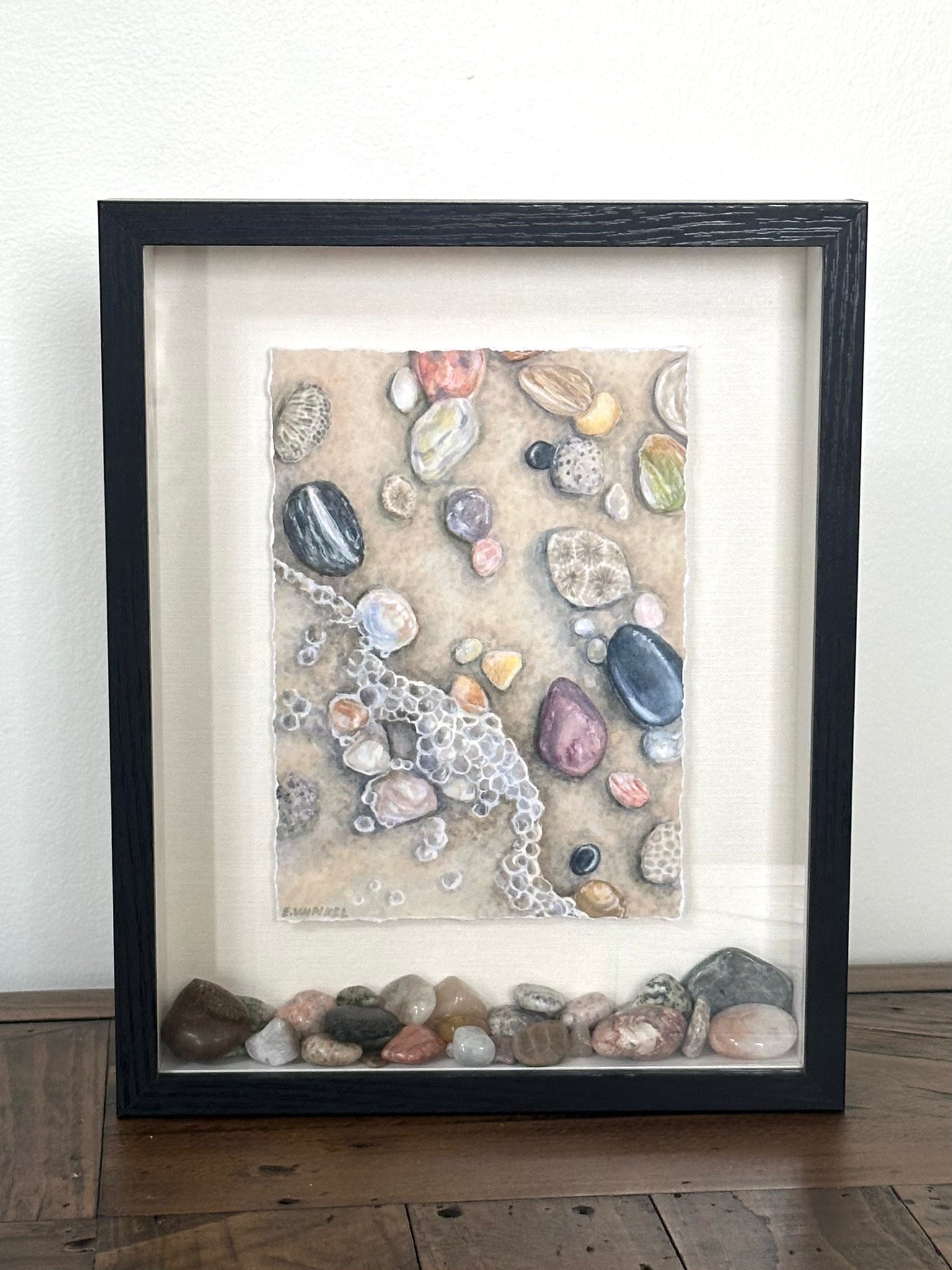 Assortment of polished Michigan rocks including 2 Petoskey stones, Charlevoix stone, and additional fossil. Rocks are loose and will come in a velvet drawstring bag to avoid damage to the frame and print.